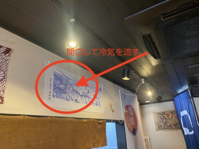 垂れ壁を開口するだけでは冷気が十分に入りきれないと思ったので、開口した部分に棚板を設置して扇風機を導入することで、扇風機で冷気にブーストがかかるようにし、厨房内に冷気が循環するように対策しました。