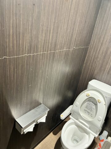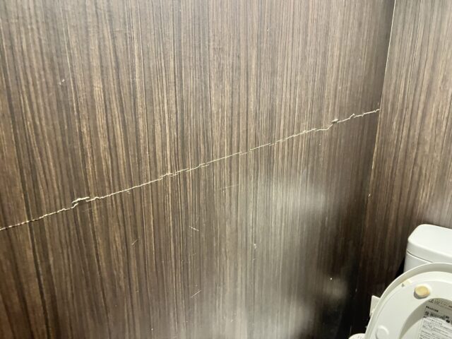 これはあるマンションの共用トイレ壁紙の写真ですが、同じ高さでクラックが横に走っていますよね。